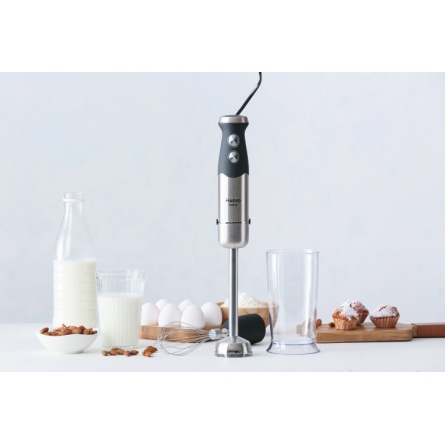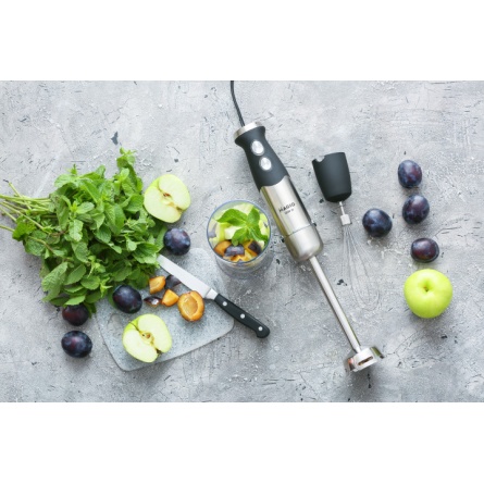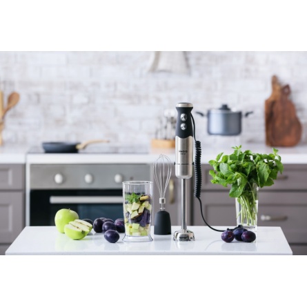Блендер може працювати на 13 швидкостях, що плавно перемикаються. Перемикач міститься на ручці приладу, що дуже зручно. У комплект входить віночок для збивання і пластикова мірна склянка об'ємом 600 мл. Ці властивості в поєднанні з компактним дизайном роблять блендер незамінним помічником на вашій кухні.