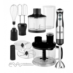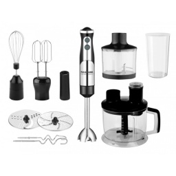 У комплектації передбачені:ніжка-блендер, що підходить до практично будь-якої ємності, пара віночків для збивання та класична чаша-подрібнювач, ємність якої становить 0,6 л.