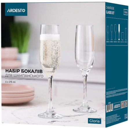 Келихи для шампанського ARDESTO Gloria мають подовжену витягнуту чашу на вишуканій ніжці. Завдяки формі чаші бульбашки утримуються довше, аби гурмани могли насолодитися смаковим букетом, естетичним виглядом і кольором напою. У нижній частині передбачено заглиблення, аби бокал був більш стійким.