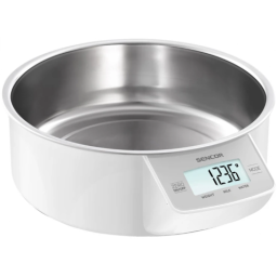 Кухонні ваги Sencor SKS 4030 WH зі знімною чашею. Поєднання стильного дизайну й функціональності. Чаша ваг знімна, виготовлена з неіржавкої сталі для легкого догляду. Крім стандартного зважування, на цих вагах можна автоматично відображати на дисплеї об'єм молока або води. При зважуванні Ви можете вибрати одиниці вимірювання (метричні або англійські) на нижній частині ваг за допомогою перемикача одиниць вимірювання. Великий РК-дисплей з підсвіткою відображає не тільки вагу продуктів, а також визначені параметри для зважування.